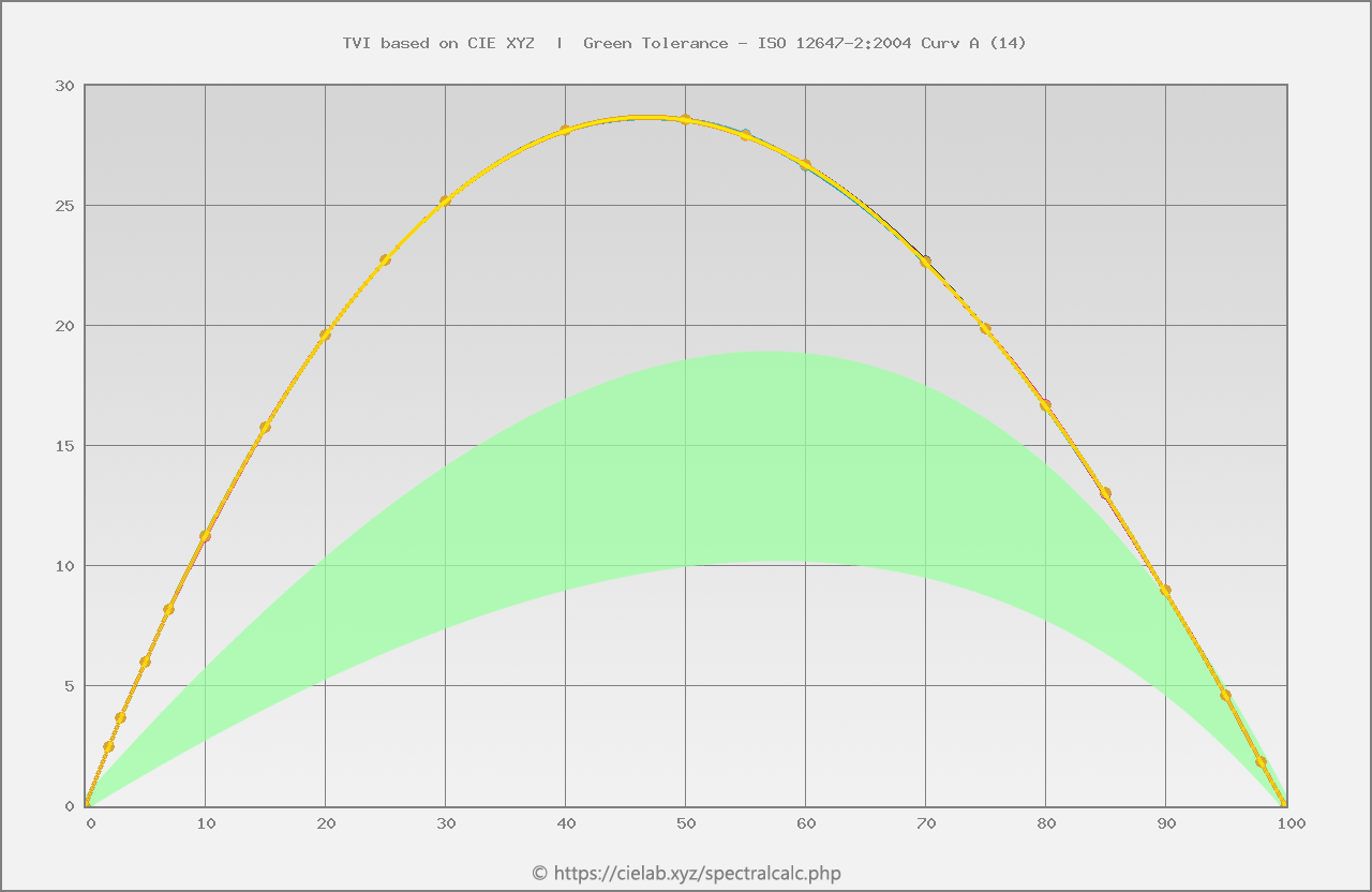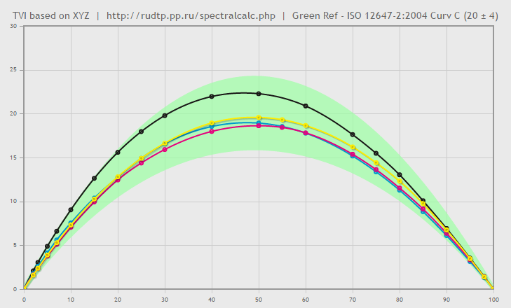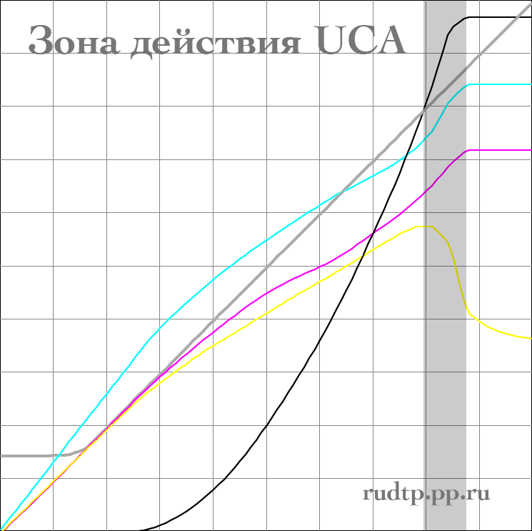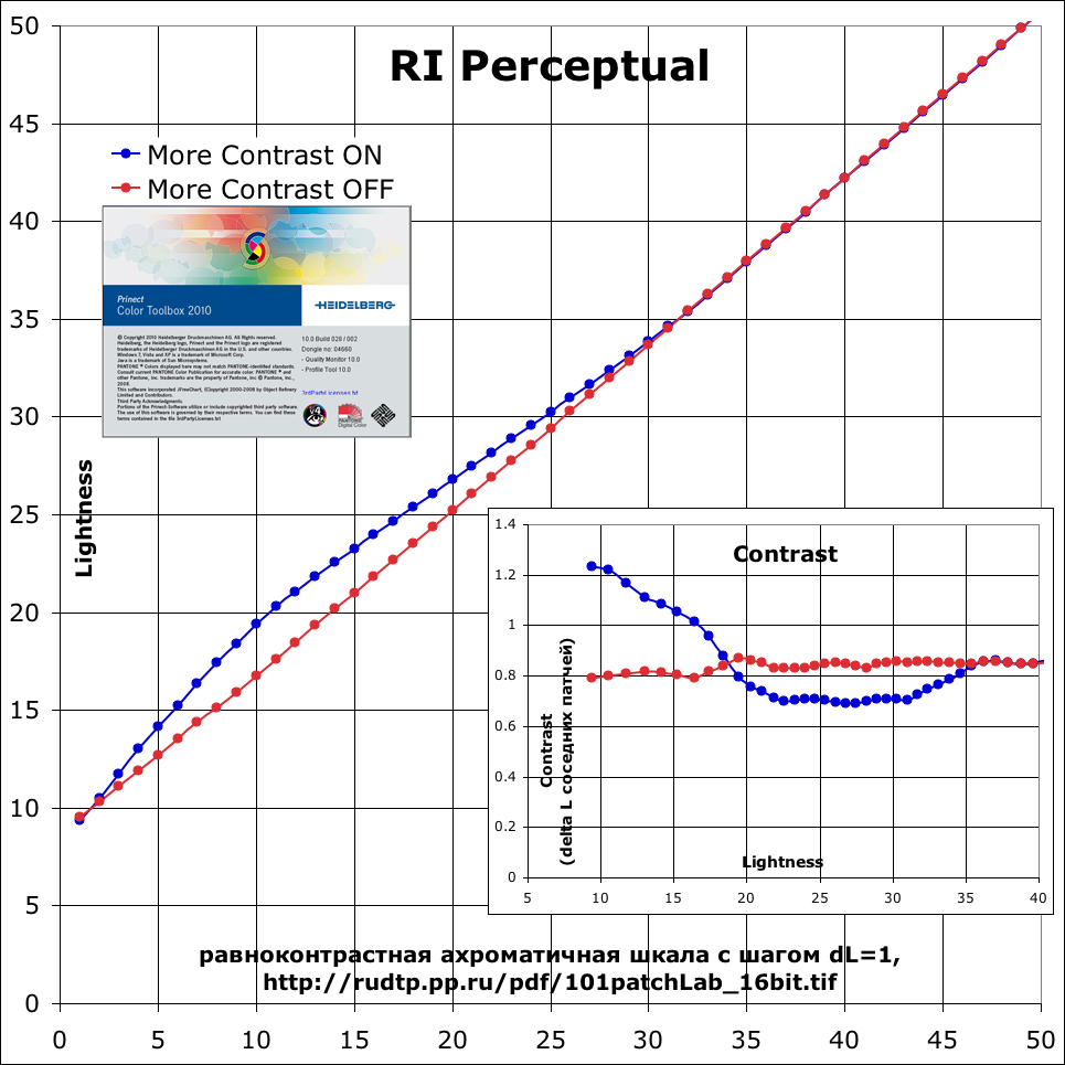 Помимо форсирования анти-UCA желтой краски при генерации всех представленных профайлов была включена опция More Contrast In Dark Colors (не влияет на колориметрическую таблицу, задействуется только в RI Perceptual). Максимально возможная ширина черного (Black Width)При малой ширине черного черная краска генерируется только в ахроматичных цветах