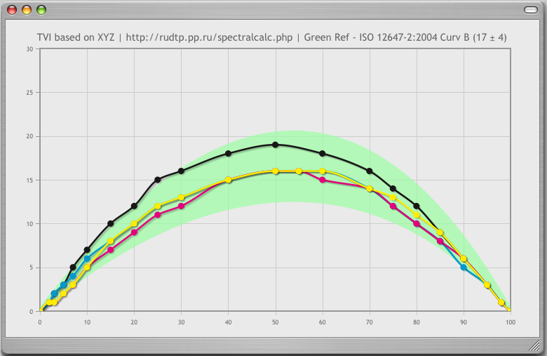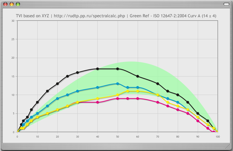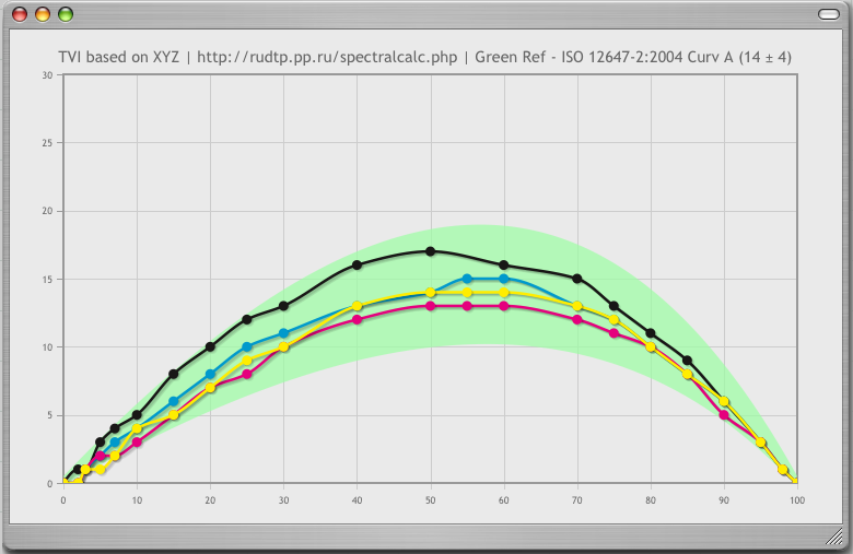 return Chroma;} в алгоритме хроматической адаптации CIECAM02. Не забывайте что сразу после цветоделения методом relative c расширенным профилем необходимо переделить изображение по методу perceptual в обычный профиль вашего офсета (например ISOcoated_v2_300_eci.icc или ISOcoated_v2_FullGamut4.icc) перед завершением цветокоррекции и сдачей изображений в печать! Перцепционные таблицы у разных профилей заметно отличаются, tristimulus RGB-профили TRC вообще не содержат таблиц Perceptual. Представленные расширенные CMYK профили позволяют как принять без искажений колориметрическую информацию в большом охвате, так и очень качественно перцепционно сжать ее для передачи в маленький охват офсета. Из всех возможных вариантов перцепции разных программ здесь представлен лучший. Дополнительную информацию можно почерпнуть здесь и здесь. Про расширенный охват eciCMYK (Fogra 53, Fogra 59) можно прочитать здесь.
