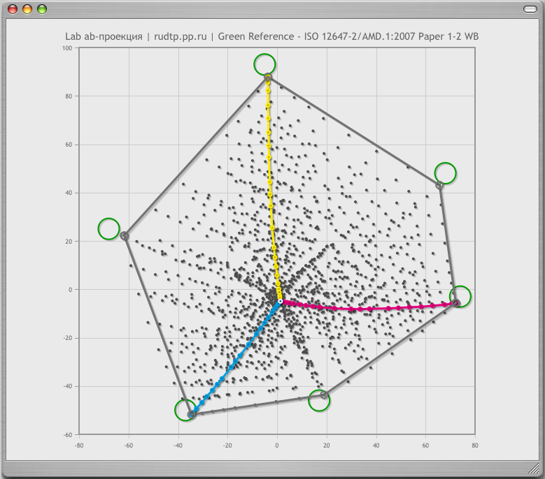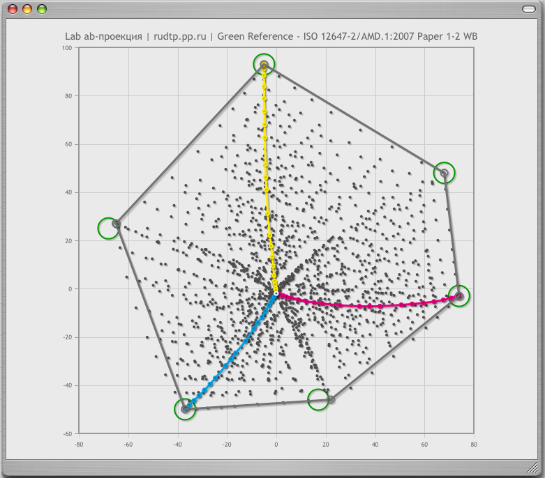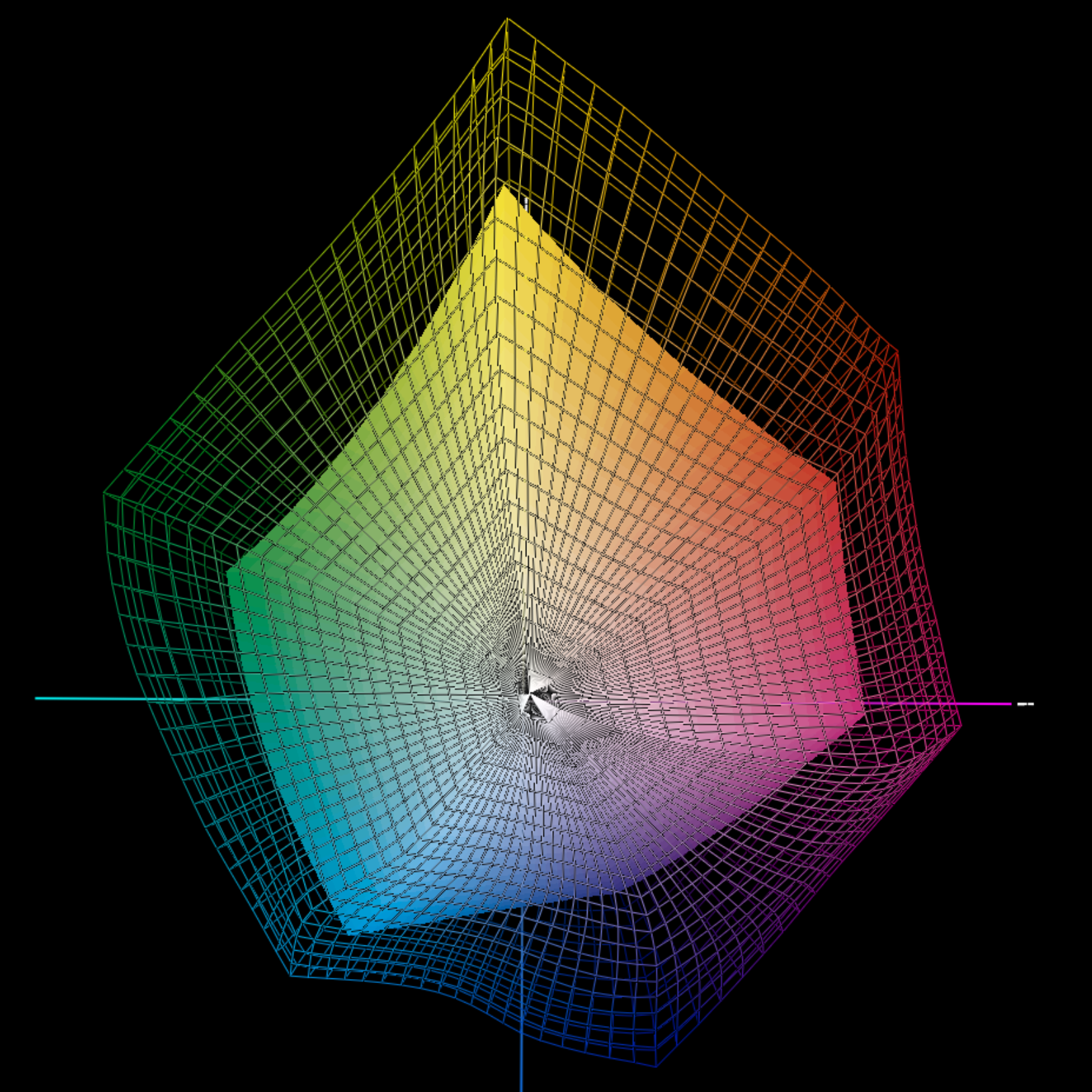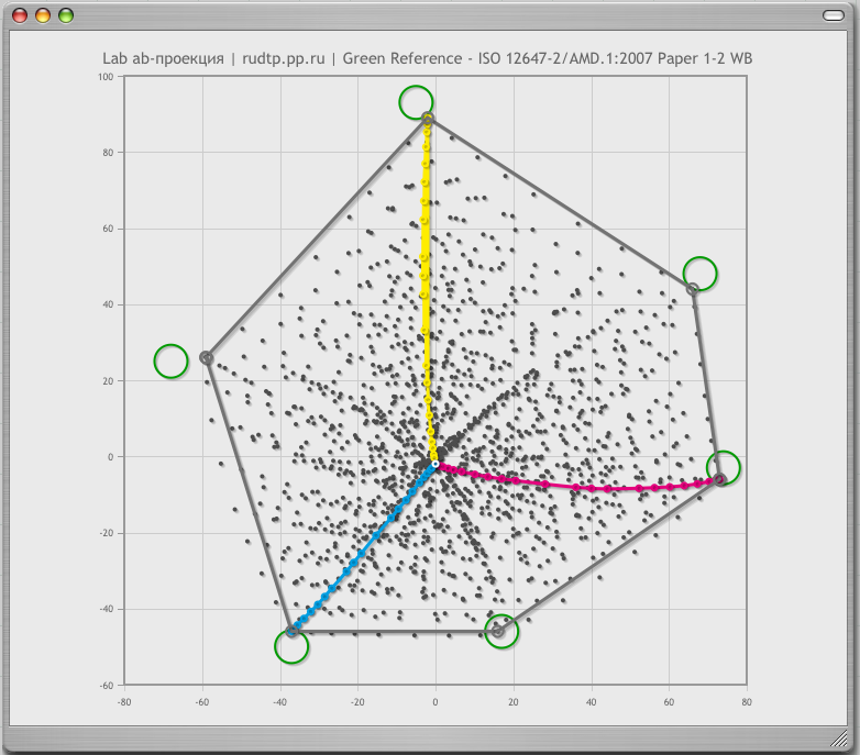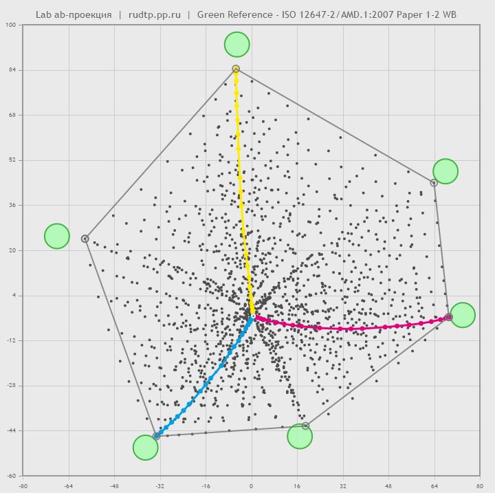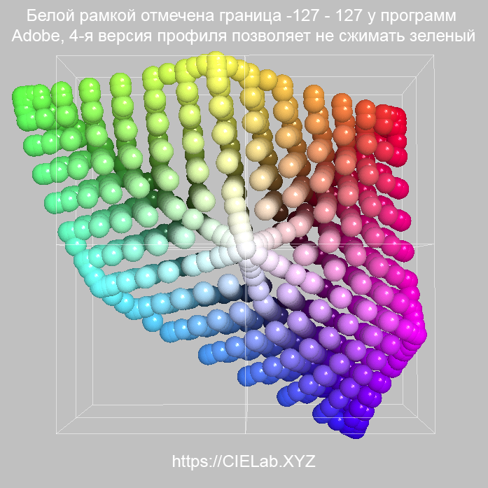 отмечена граница -127 - 127 программ Adobe. Четвертая версия профиля позволяет не сжимать зеленый. повторяет колористику и гамму 2.2 пространства AdobeRGB(1998), приведен от белой точки D65 к белой точке D50 с помощью матриц Брэдфорда. Сделана компенсация черной и белой точки, в силу чего объем цветового охвата немного меньше AdobeRGB, но в проекции ab повторяет его колористику при хроматической адаптации к D50. Данный техногенный непечатный профиль предназначается как промежуточный для опосредованного участия в цветоделении и цветокоррекции и для особенного перцепционного перехода между большим Adobe RGB и маленьким триадным офсетом с сохранением локальных контрастов за охватом офсета. Черный канал как у стандартных профилей ECI, Black TAC = 240 в балансе 60-42-38-100. |
